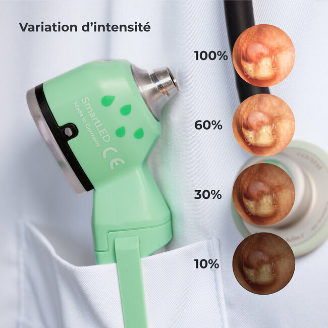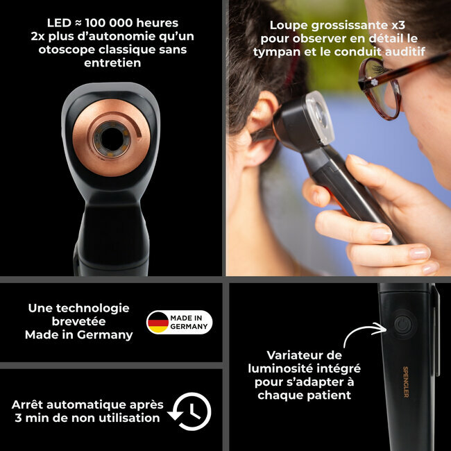 L’Otoscope SmartLED Spengler x Luxamed Edition® est un outil indispensable pour les professionnels de santé souhaitant allier performance, durabilité et ergonomie. Son éclairage LED ultra-puissant, sa loupe grossissante x3et ses fonctionnalités avancées garantissent un confort d’utilisation optimal et une précision accrue lors des diagnostics